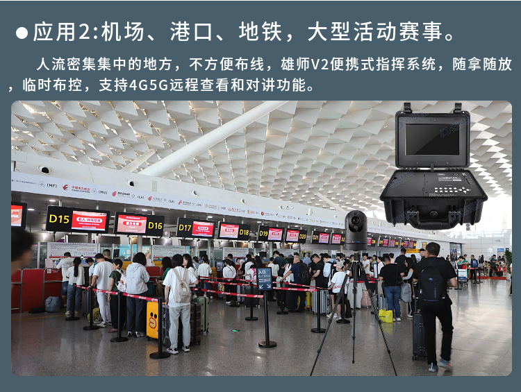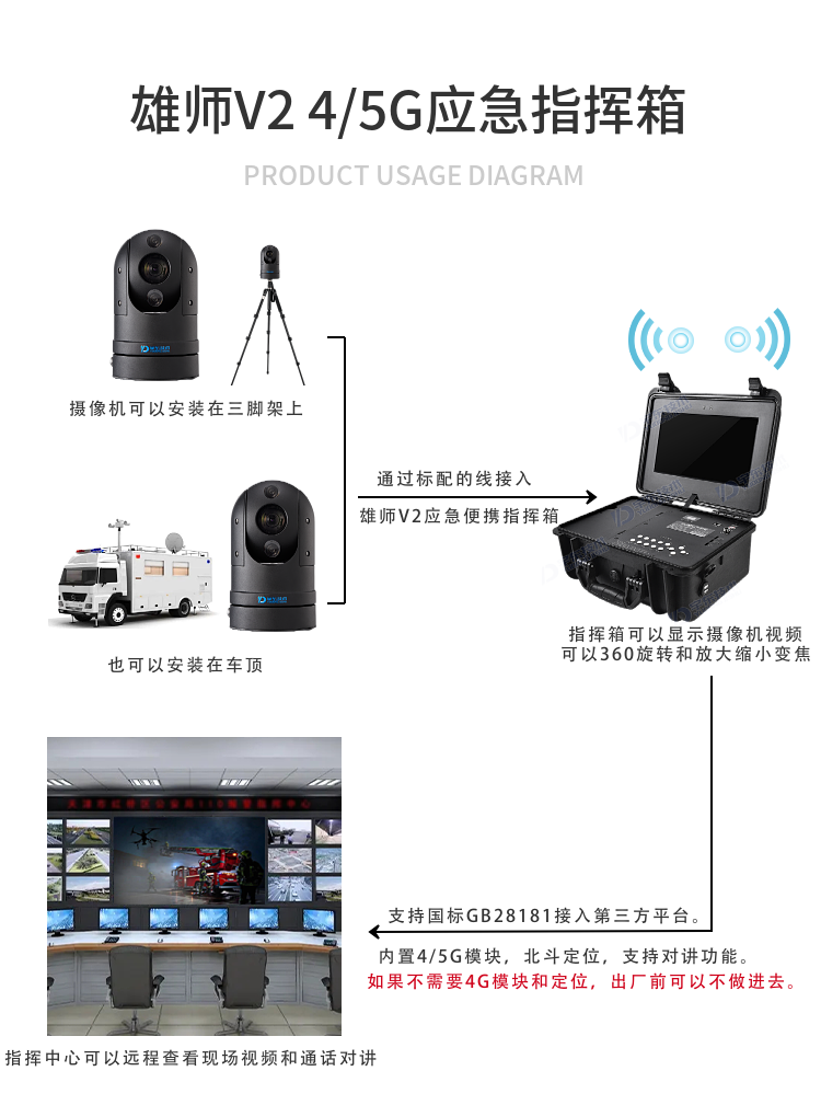 雄師V2 4/5G高清應急便攜指揮箱是一款功能全面、攜帶方便的無線視頻指揮一體化產品,超高設備集成度,內置高性能鋰電池組,具備防水防震等特性的應急指揮箱,可滿足臨時布控和快速安裝的特殊要求。執(zhí)行任務時可快速將設備臨時安放在需要監(jiān)控的位置或直接吸附在車輛上,任務結束時可方便將設備拆下,適用于外勤執(zhí)法、偵查布控、安防安保、應急指揮、搶險搶修、巡線管理等行業(yè)應用,比如公安、交警、消防、路政、城管、交通、法院、監(jiān)獄、林業(yè)、電力、水利、環(huán)保等單位。為用戶提供高清、流暢、穩(wěn)定的視頻效果,能實現北斗定位、遠程視頻查看、雙向語音對講、錄像保存回看等功能。“聽得到、看得見”是針對突發(fā)緊急事件的一整套應急指揮設備,為實現應急指揮的“通信暢通、現場及時、數據完備、指揮到位”提供技術保障,可廣泛應用于應急指揮、公安、刑偵、交巡警、消防、部隊、人防應急、邊防、城管、電力、路政等領域。