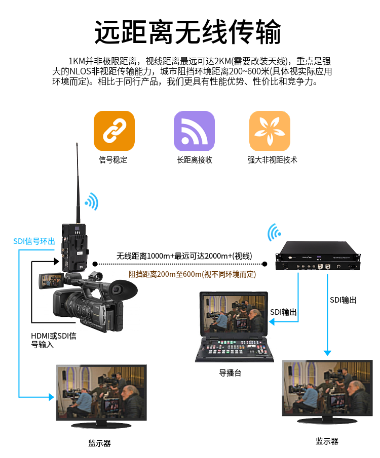 雷神2號無線圖傳雙V扣扳式廣電直播無線視頻傳輸系統(tǒng),非視距(環(huán)境復(fù)雜、可穿墻、人多、車多、樹多及障礙物多的地方),高清無線圖像實時傳輸系統(tǒng)主應(yīng)用于廣播電視臺、影視拍攝、教育直播、大型演唱會、電影電視制作、體育轉(zhuǎn)播、社會新聞、空中實況、演播室、公安、消防、海事、 交警、人防應(yīng)急、城管執(zhí)法、三防應(yīng)急等方面。可訂制外觀及功能,地面視距:1~2公里;非視距:200~600米。具體視實際應(yīng)用環(huán)境而定,可選擇HDMI輸入或SDI輸入, SDI輸出等。